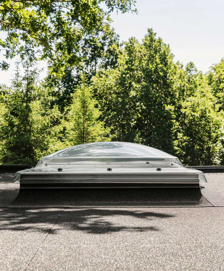 Acrylic –or polycarbonate dome skins let in daylight and fresh air through the flat roof, without compromising on energy efficiency.